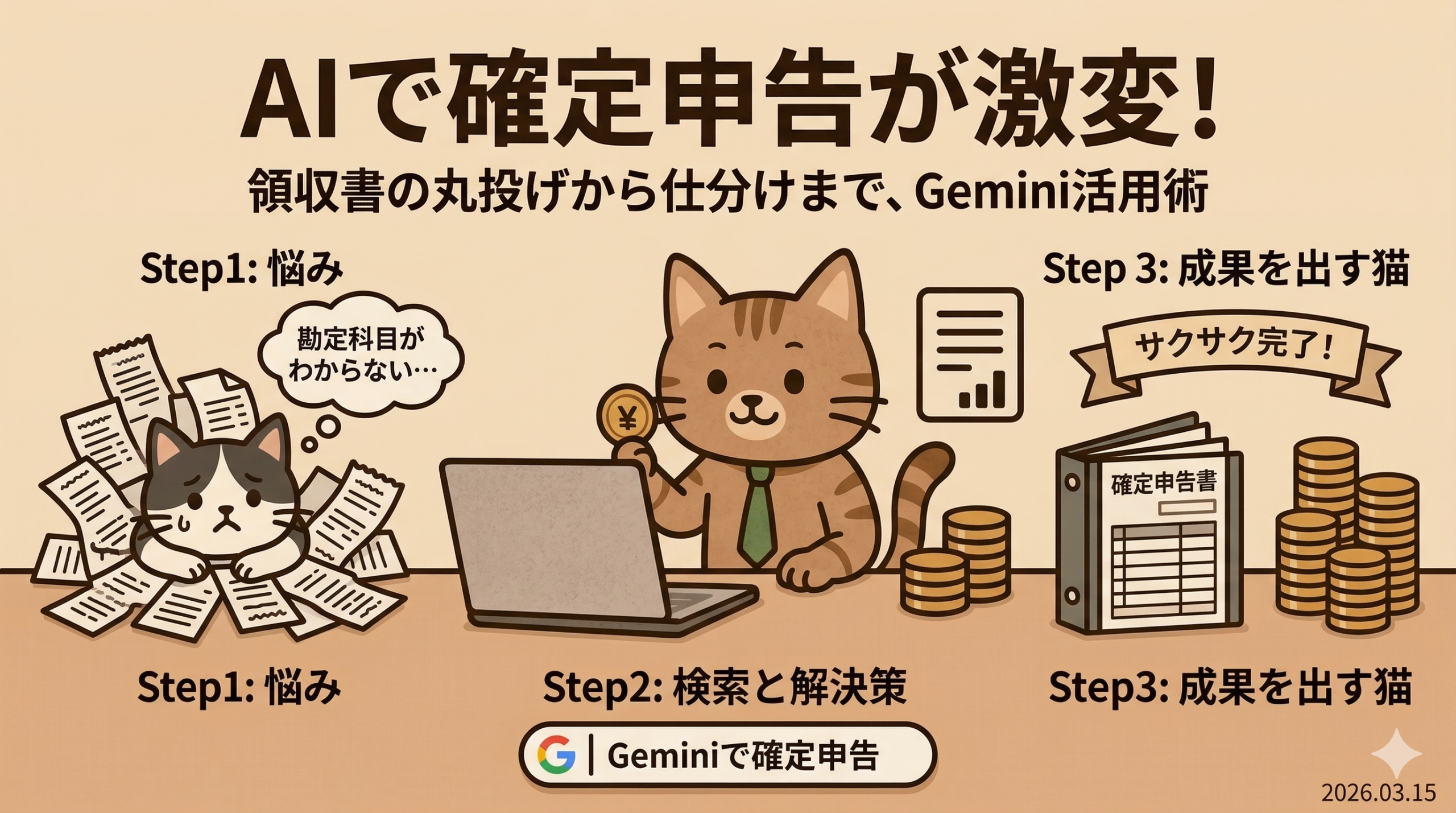 手元にある直近の領収書を1枚だけGeminiにアップロードして、勘定科目を聞いてみてください。「え、これでいいの?!」という驚きが、きっとあるはずです。